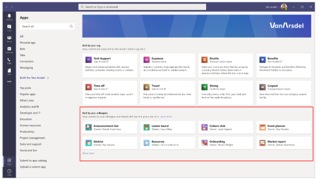 With these experiences, you can granularly set what level of access end-users have to the underlying data and then pick and choose which apps they should have access to. Afterwards, the apps will appear in the Built by your colleagues section within the Teams app store.
