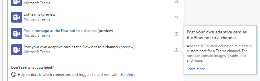 You can now post your own adaptive card as the Flow bot to a channel. An adaptive card is a way to present richly formatted content directly into a teams conversation. Adaptive cards can contain components like images, graphs, richly formatted text and more. To get started, select the new action on the Microsoft Teams connector: