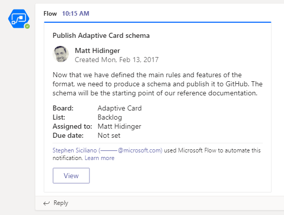 Once you have added all of the elements that you want on the card, open the JSON pane at the bottom and copy everything there. Then, paste that entire content in the Message field on the action in the Flow designer. When the action runs, a nicely formatted adaptive card will appear in the Teams channel you selected: