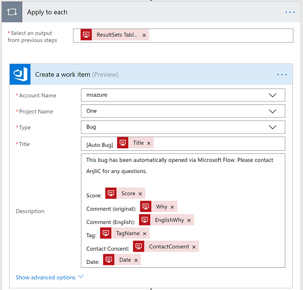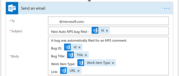 On a daily basis, the flow executes a sql query that returns a result set with all comments that were tagged with ‘Open Bug’ in the last 24 hours. For each comment, a bug is opened in Visual Studio and an email is sent to the team with the link to the bug.