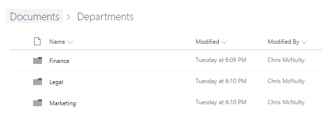 Let’s imagine that you are a SharePoint administrator for the world’s greatest imaginary company, Contoso. At Contoso, you have a document library that hosts documents for each of your departments – Finance, Legal, and Marketing. Each department has its’ own folder.