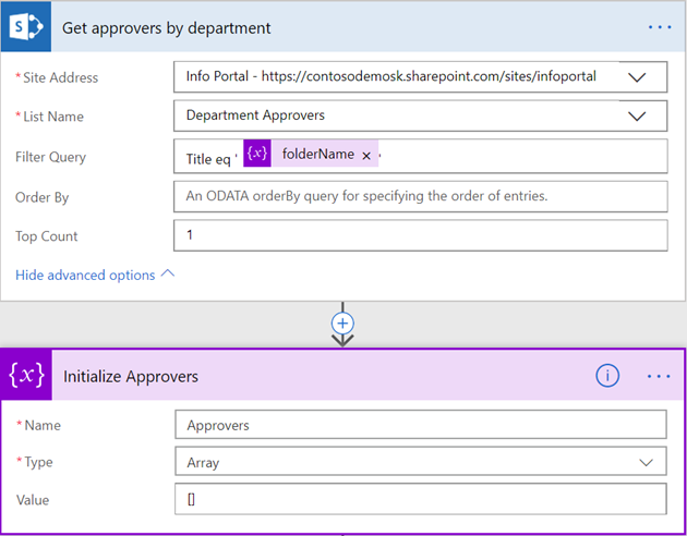 Having established which folder the selected file is located in, find the relevant approvers for that folder/department. Call the Get items action on the Department Approvers list (labeled as Get approvers by department below) and use an ODATA filter query such as Title eq ‘[folderName]’ with Top Count of 1. Next, initialize an array variable called Approvers. This array will be populated with approver emails.