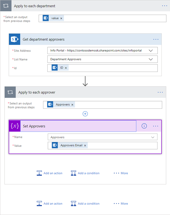 Since the Get approvers by department action returns an array of values (albeit of size 1), you’ll need to add an apply to each loop and iterate over the array. For each item, first Get the item properties (Get department approvers). Then, create another apply to each loop to iterate over Approvers (recall that Approvers is a multi-value people field) and append it to the Approvers variable (using the Append to array variable action).