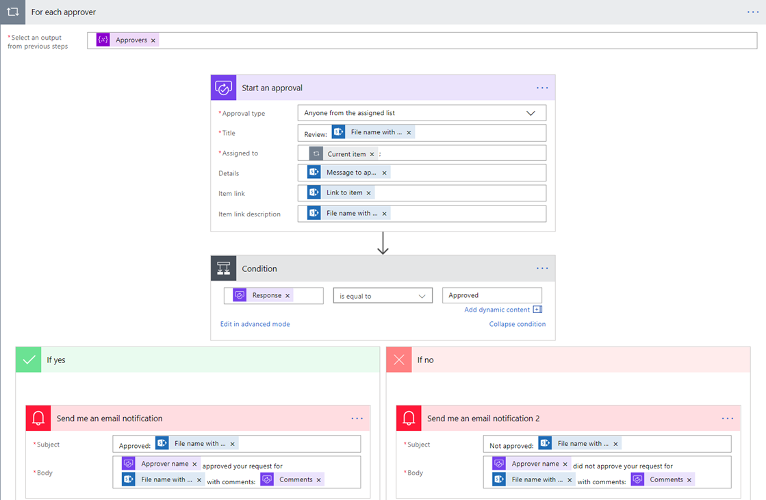 Finally, iterate over the Approvers array with another Apply to each loop. This loop contains a Start an approval action and a condition that sends an approval or rejection notification based on whether the Response is “Approved” or “Rejected”. Note – you can reference the currently selected item (approver in this case) using Current item attribute.