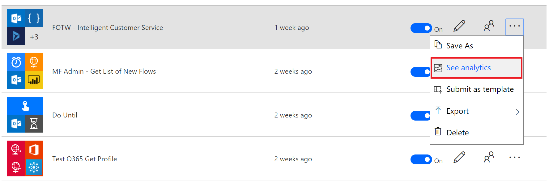 - Option 1: From the Maker Portal (https://flow.microsoft.com), navigate to the My flows or Team flows lists, click on the … dropdown and then click on See analytics.