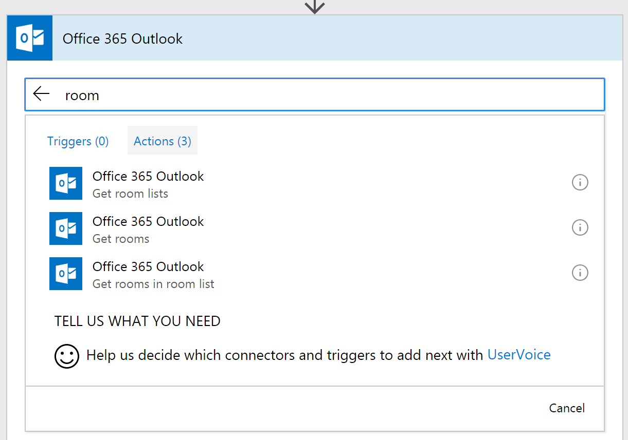 There are new actions in the Office 365 Outlook connector that you can get details about the rooms in your organization. This is useful for meeting scheduling solutions. The specific new actions are Get room listGet rooms, and Get rooms in a room list.
