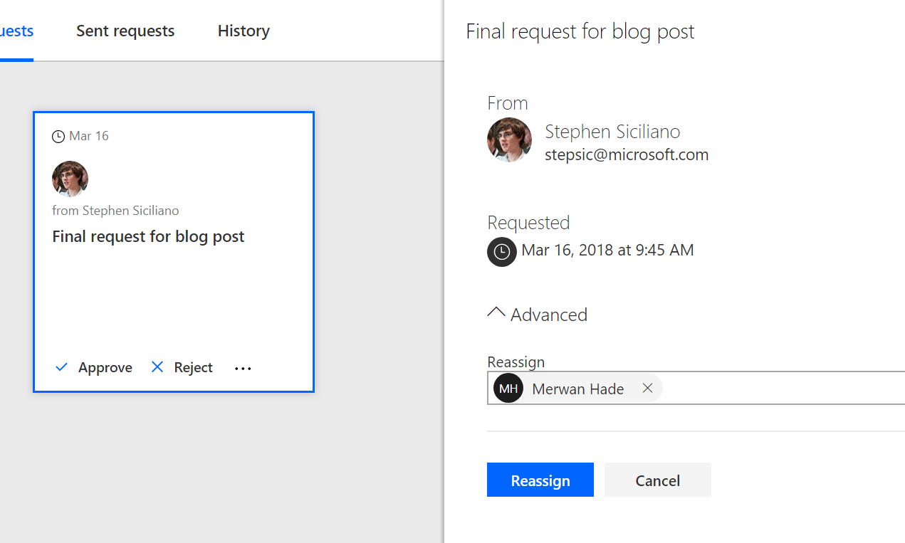 You can also reassign from the “…” menu on each Approval in your received requests.