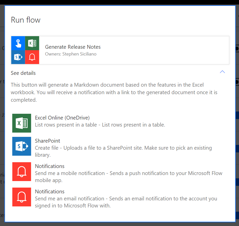 When you run a flow that has been shared with you, you can now see details of exactly what that flow is going to do with your connections. Whenever you run a flow, select See details, and you’ll be presented with a list of every action that flows uses (both name and description). Since the flow can use your accounts or connections, you should only ever run a flow if you trust the owner of the flow, and, are comfortable with them taking the actions listed under See details