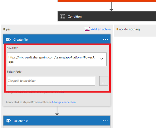 In the If yes branch of the condition you will now fill out the Create file step. This is where the approved file will go. This doesn’t need to be the same SharePoint site as where the file came from.