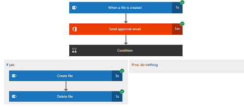 Once you Create the flow, you can test it out by adding a file to the Site and Folder that you chose in the trigger (and the Delete step). If you do this while the page is still open, the designer will automatically show you the status of the approval. You should see the email almost immedately.