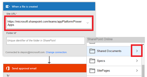 Once you select your accounts, you’ll click Continue and need to fill out the When a file is created step. You’ll copy-and-paste the Site URL (or select from your recent sites), and select what folder you want to watch for new files. You can navigate into a folder by clicking the arrow on the right side of the folder list.