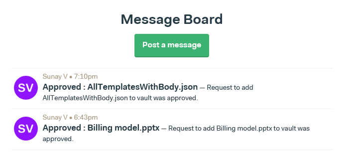In case, the request for uploading the file to the BaseCamp vault is declined, a message recording the rejection of the request is also logged to the project message board.