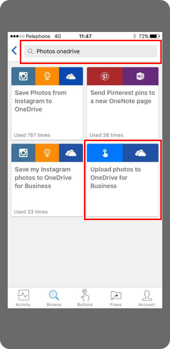 Let’s create a flow from the template Upload photos to OneDrive for Business. You can either navigate to it direct from the link, or in the Browse tab, search for keywords like “photos” and “OneDrive”.