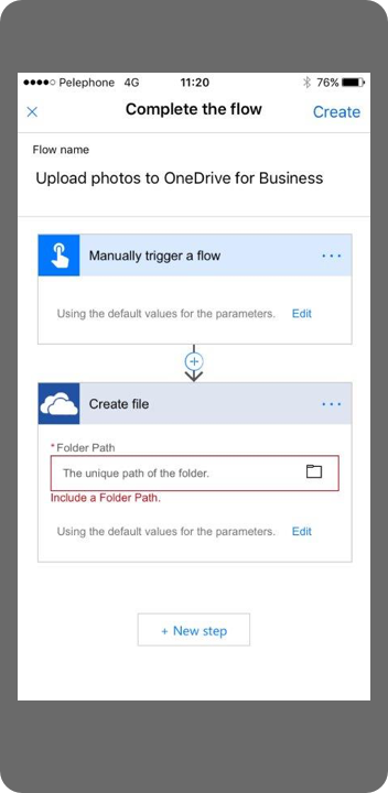 Now enter the OneDrive Folder path where you wish to store the images, and then choose ‘Create’ to complete flow creation.