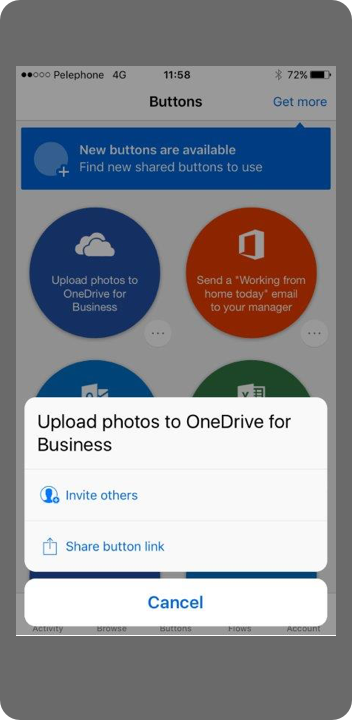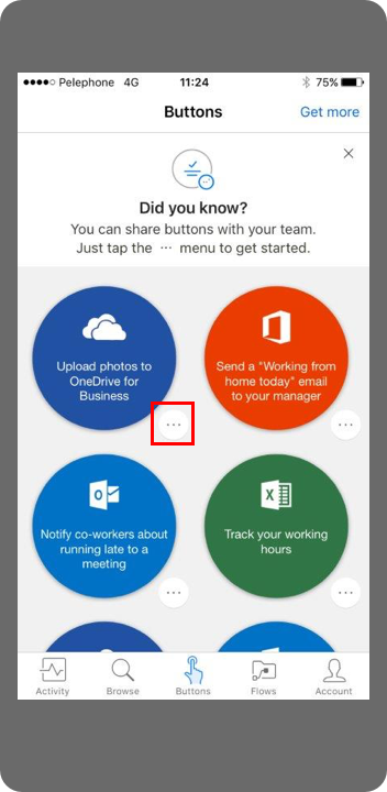 You can also choose to share it with your team later on. Just locate your new button on your buttons tab, and tap the options menu to get started. The selected people or groups will receive a mail inviting them to use the button and to add it to their buttons tab.