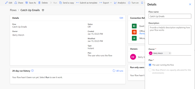 If the flow is a scheduled or Automated flow, once the owner is changed, the flow will run under the license of the new owner and use their Power Platform request limits. If the flow is a manual flow, the flow will run under the license of the user who runs the flow. The Plan section shows whose license plan is used by the flow.