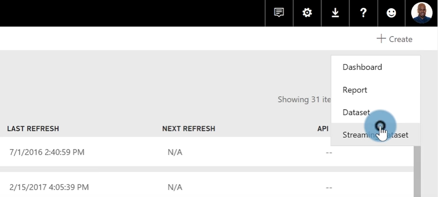 We want to use Microsoft Flow to take this data and turn it into a streaming dataset in Power BI, which can then have reports and dashboards built on top of it. How you’re storing this data set is up to your organization — you probably already know that Microsoft Flow has a connector for almost everything, from a highly optimized SQL Server or MySQL database to a simple Excel workbook or Google Sheet. Once you’ve identified your source, you can set it up as streamingdata set on the Power BI service. After logging into the service, click the Create button in the top right corner, and select Streaming dataset.