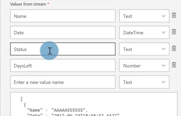 Microsoft Flow can push data directly through the API, so select that as your data source. Give the streaming dataset a name, and enter the names of the columns from your original table that you want to include. When you’re done, it will look something like this: