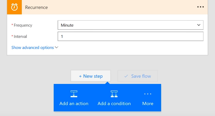 It’s time to create the flow! Log into Flow, and Create from blank. Next, select the Schedule connector and specify when the dataset will update. Click New Step, and then click Add an Action.