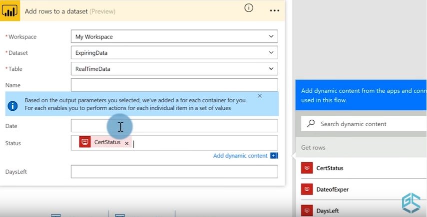 Find your data source in the list — SQL Server, Excel, whatever you’re using. You want multiple rows, so select Get rows from the available actions. Connect to your data source, and choose your certification table from the drop-down list. Click New Step and Add an Action again, and find Power BI in the list of connectors. We want to Add rows to a dataset, so enter the information needed to connect to your Power BI workspace, dataset, and table. Drag and drop to match the columns from your original dataset to the columns in your streaming dataset.