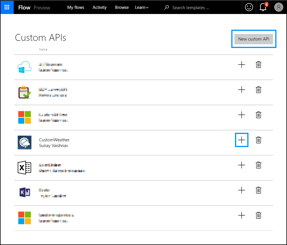 Once you have successfully created the custom API, create a connection for it by clicking on the “+” button.