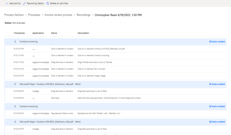 Process advisor now support auto creating activities from the recording. We automatically group related recorded actions into a single activity and create a label that accurately describes the user’s action.