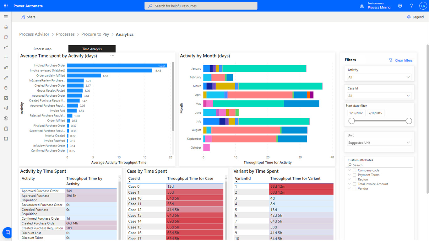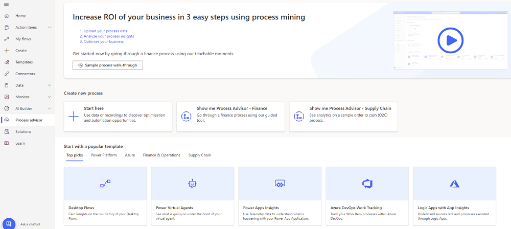 Process advisor brings the generally available task mining capability, which provides insights across individual workflows, together with process mining to provide organizations with a holistic view of company-wide bottlenecks and inefficiencies. Process advisor ties together the insights from your business processes with low-code automation in Power Automate.