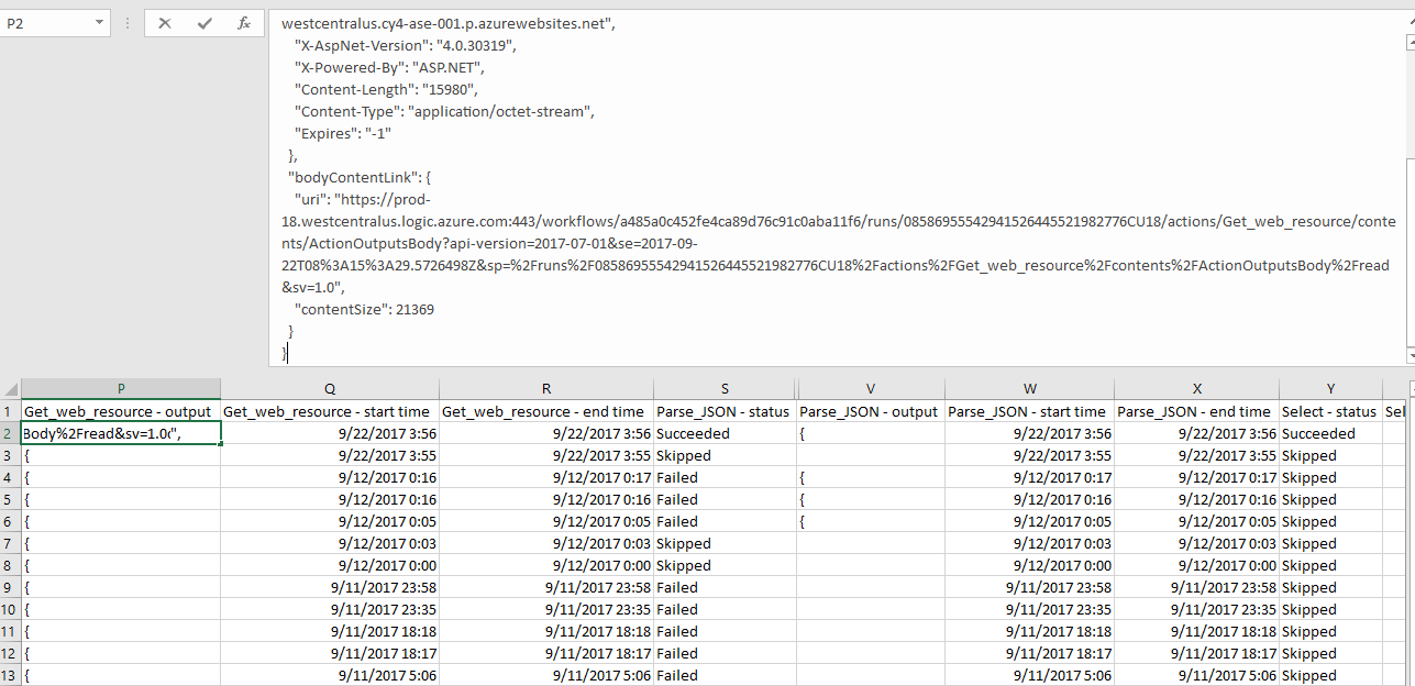 Microsoft Flow has always had a highly detailed history view, where you can click on a single flow run and see exactly which steps have succeeded or failed. However, if you have a large number of flow runs, it can be difficult to find a specific failure. Now, you can Download a CSV of your flow run history and use Excel (or any other tool) to search across all of your flow runs, see exactly when they happened, and even the inputs and outputs of most steps.