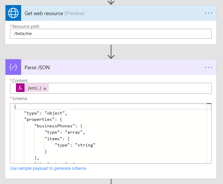 To set up the connection, you will need to provide a base URL and an Azure AD resource URL. For example, if you want to connect to Microsoft Graph, use https://graph.microsoft.com for both of these inputs. Then, you can make any HTTP GET on the Graph API that you want. If you enter /beta/me, you can retrieve your user details. Like the normal HTTP action, if you want to use certain properties from the response then you’ll need to use a JSON Parse action.