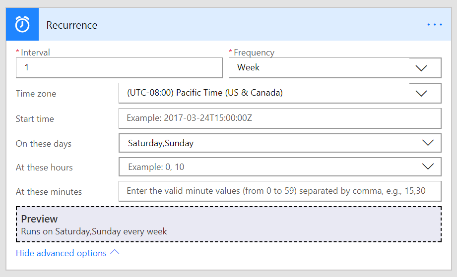 You can now build more advanced recurring schedules with the Recurrence trigger. For example, you can now build a schedule that will run a flow at 9 AM only on weekdays, or, a flow at 10 AM and 3 PM every day.