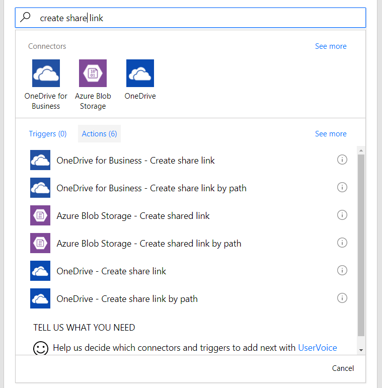 Finally, we have added new actions to the OneDrive, OneDrive for Business and Azure Blob Storage connectors that allow you to create “sharing” links for your files — links that grant the person with the link access to the file so that they can view it.