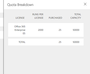 The Quota Breakdown view lists the number of runs per license, the number that are purchased, and thus what your total run capacity is. Finally, you can always purchase additional Flow Runs if your company is nearing its quota at the end of the month.