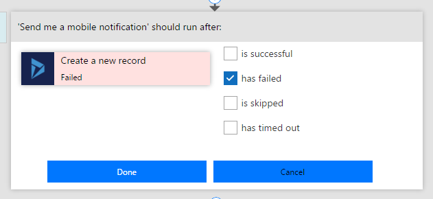 Select any or all of these checkboxes and then select Done. Now, you will get a mobile notification whenever the flow fails to create a new record in Dynamics 365.