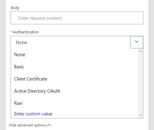 After you have selected the action, select Show advanced options and then select Authentication. The default is None, but you can choose one of four other types of authentication. After you select the endpoint’s authentication type you will be able to configure any specific data you need to send.