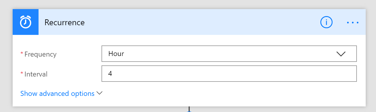 Let’s start by using a recurrence trigger. We dont need the sentiment analysis to happen line-by-line as the data arrives, so we can save ourselves some Flow runs by checking every four hours, or even once per day. To do this, type Schedule in the connectors box, select Recurrence as the trigger, and set it to 4 Hour. Click + New Step, then Add an Action.