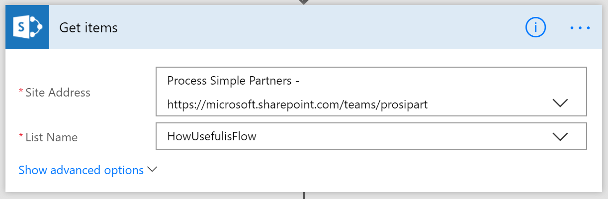 For the next action, search for the SharePoint connector to pull from our SP list where we are storing the data, and choose the action Get Items.