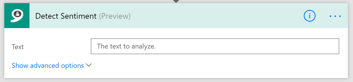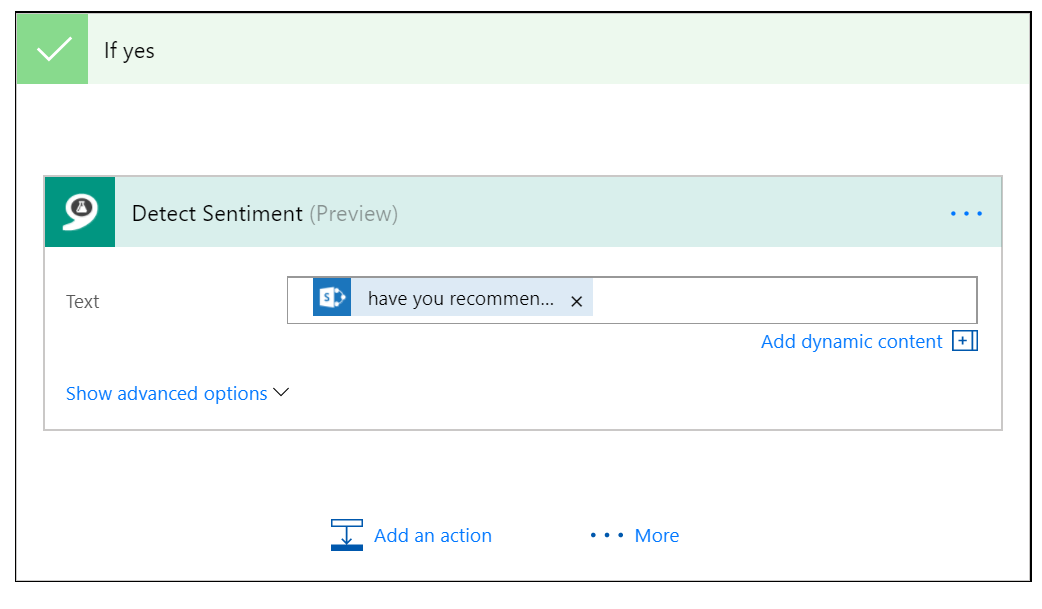 Now in the If Yes side of the condition choose +New Step. Then Add an Action and type Detect Sentiment. (This connector will require you to go to Azure and get a FREE Cognitive services API Key.)