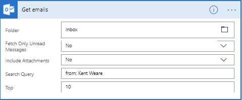 - The next step that we want to run is the Office 365 Outlook – Get emails action. This action will allow us to retrieve the last 10 emails. We can also provide a Search Query, much like we can in the Outlook client. This is where you can provide a from: parameter indicating the person whose emails you want to target.