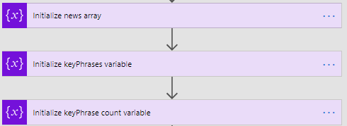 - To simplify our processing, we will create 3 variables that we can use to store information like the News articles returned by Bing, our Key Phrases returned from Cognitive Services and a variable that will allow us to count our Key Phrases result.