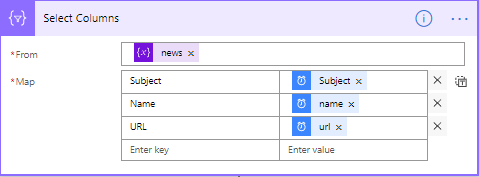 - We don’t want to include all of the data (attributes) from our Bing search results so we will use the Select Columns action to include only Subject, Name and URL.