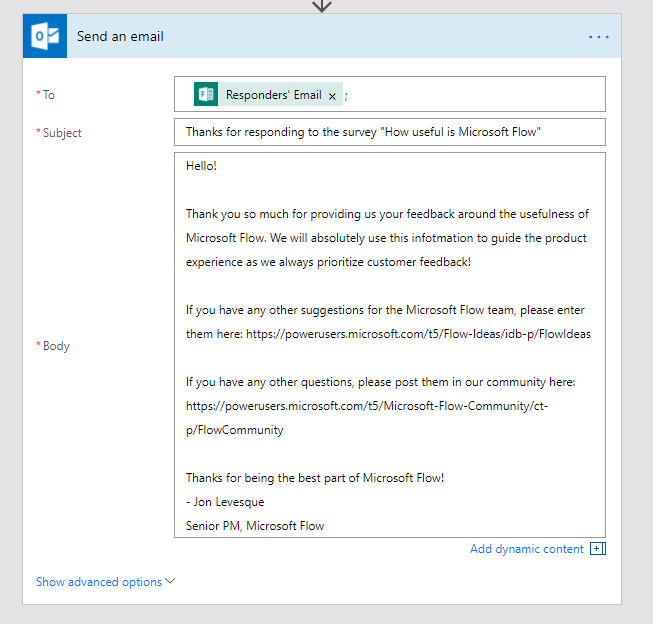 Now that I have the data being sent to SharePoint for record keeping, and to PowerBI for reporting, I also want to send an email to everyone responding to let them know that their responses are appreciated.