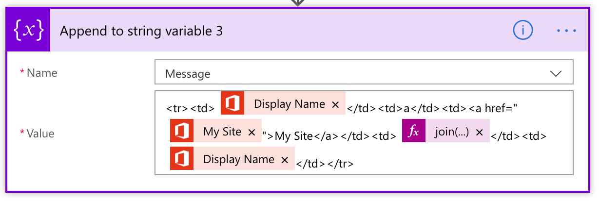 The last action inside this second Apply to each loop is to Append to string variable again. This time, you’ll add the contents of each table row you want inside the email. You can include any fields from the user profile, such as a link to their My Site, About Me, or their Hire Date.