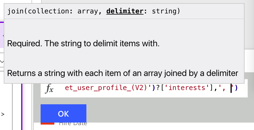 - Select the Interests output (or any of the other lists) – this should add the interests array into the join() expression