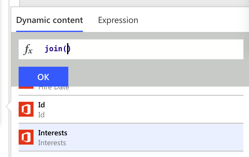 Some of the properties output by Get user profile are lists – for example a list of interests, schools or skills. You can use the Join action to turn this list into a single string that you can use in the email. You can also use the join() expression to do it inline without having to create a different step. For example, I wanted a list of interests and a list of skills and interests, I’ll show how to do that in an expression.