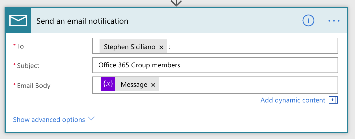 Now you’re ready to send the email. You should add that action at the very bottom of the flow (if you added it in the Apply to each you’ll get more than one email). In the Send an email notification action you can fill out the To and Subject fields with whatever you’d like. In the Email Body, all you need to do is use the Message variable – it already has all of the groups and tables of their members, so you don’t need to add anything else to the Body.