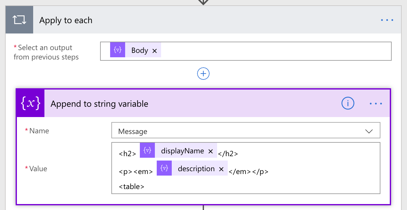 Inside the Apply to each we are going to start constructing the email. For each group we’ll add a heading and the description by using the Append to string variable action. All you need to do is select the variable you created earlier, and then include the content that you want, such as the displayName of the group. Also, for the next step add a new <table> tag at the bottom of the variable.