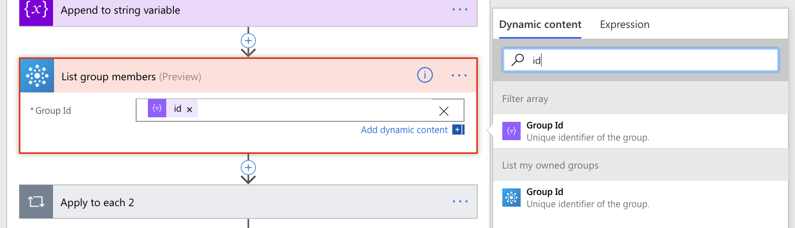 Now that you’ve started creating the email, you’ll need to actually retrieve the members of the group. Use the List group members action. In the Group Id field, do not select one of the items in the dropdown, but go to Enter custom value instead. This allows you to Add dynamic content and select the Group Id from the Filter array action (you should search in the Dynamic content window to find this).
