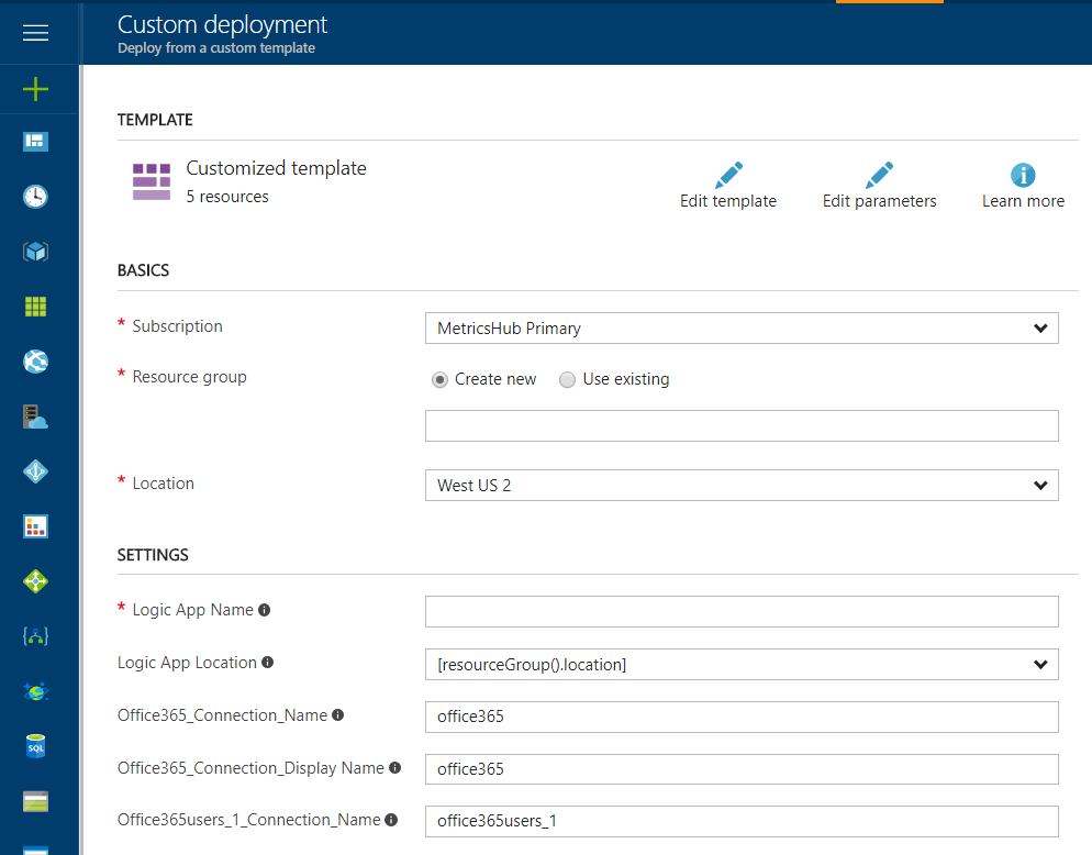 The next step is to use this resource template to create the Logic app in the resource group of your choosing. There are several ways to deploy an Azure resource template: you can use Visual Studio, Powershell, or the Azure Portal. I will demonstrate this in the Azure Portal, but all methods work for these resource templates.