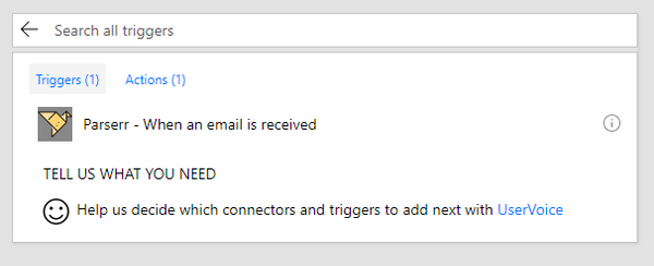 10. Now its time to jump into Microsoft Flow and connect Parserr to SharePoint! Choose to create a new Flow and choose the Parserr connector and the trigger “Parserr – When an email is received”.