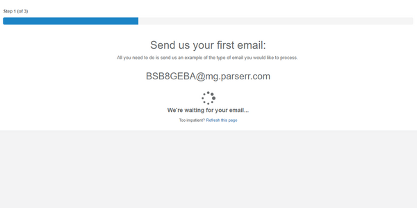 3. The next screen will provide you with your incoming email address. This address is where you will forward all your incoming inquiries that you wish to extract to SharePoint. Go ahead and copy the email address provided. Then make sure to forward a valid inquiry or email you wish to extract and make a note of your unique Parserr inbox (eg. BSB8GEBA@mgparserr.com) as shown below